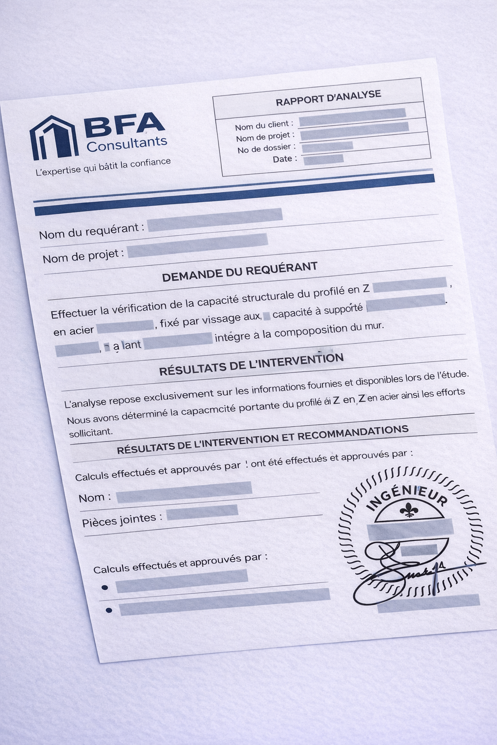BFA Consultants regroupe 3 ingénieurs membres de l’OIQ. Plans, attestations et avis techniques conformes aux exigences en vigueur.